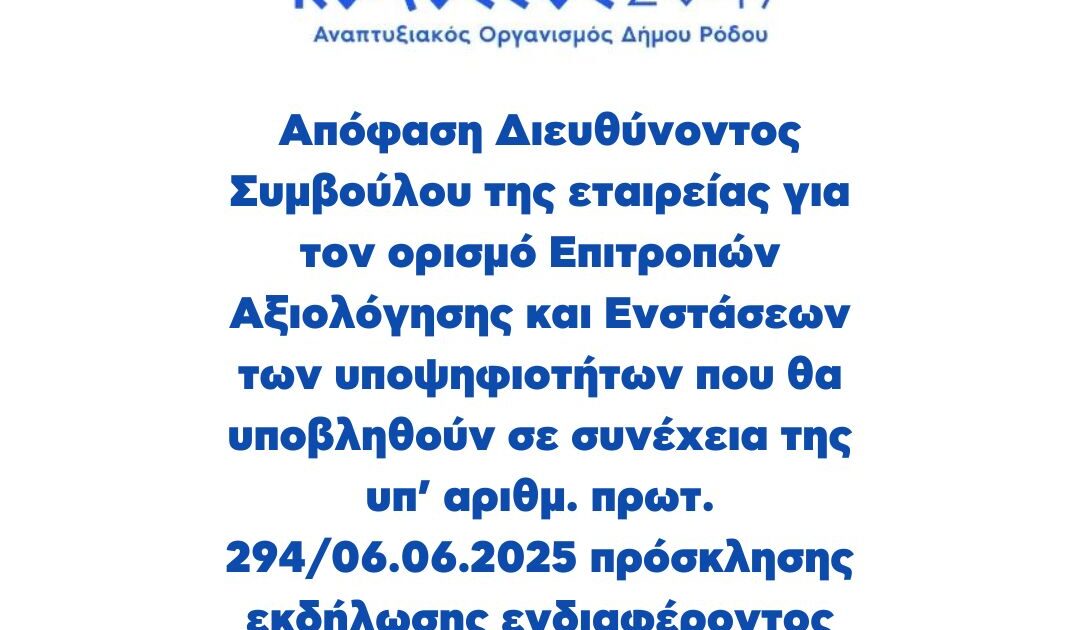 Απόφαση Διευθύνοντος Συμβούλου της εταιρείας για τον ορισμό Επιτροπών Αξιολόγησης και Ενστάσεων των υποψηφιοτήτων που θα υποβληθούν σε συνέχεια της υπ’ αριθμ. πρωτ. 294/06.06.2025 πρόσκλησης εκδήλωσης ενδιαφέροντος