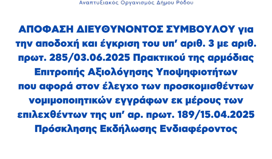 ΑΠΟΦΑΣΗ ΔΙΕΥΘΥΝΟΝΤΟΣ ΣΥΜΒΟΥΛΟΥ για την αποδοχή και έγκριση του υπ’ αριθ. 3 με αριθ. πρωτ. 285/03.06.2025 Πρακτικού της αρμόδιας Επιτροπής Αξιολόγησης Υποψηφιοτήτων που αφορά στον έλεγχο των προσκομισθέντων νομιμοποιητικών εγγράφων εκ μέρους των επιλεχθέντων της υπ’ αρ. πρωτ. 189/15.04.2025 Πρόσκλησης Εκδήλωσης Ενδιαφέροντος