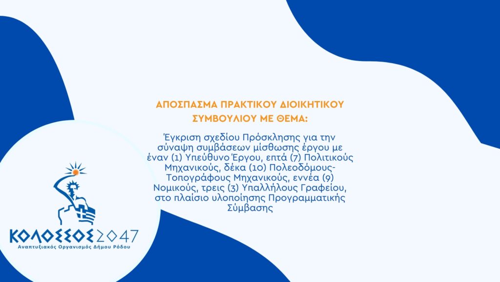 Απόσπασμα Πρακτικού Διοικητικού Συμβουλίου με Θέμα: Έγκριση σχεδίου Πρόσκλησης για την σύναψη συμβάσεων μίσθωσης έργου με έναν (1) Υπεύθυνο Έργου, επτά (7) Πολιτικούς Μηχανικούς, δέκα (10) Πολεοδόμους-Τοπογράφους Μηχανικούς, εννέα (9) Νομικούς, τρεις (3) Υπαλλήλους Γραφείου,στο πλαίσιο υλοποίησης Προγραμματικής Σύμβασης
