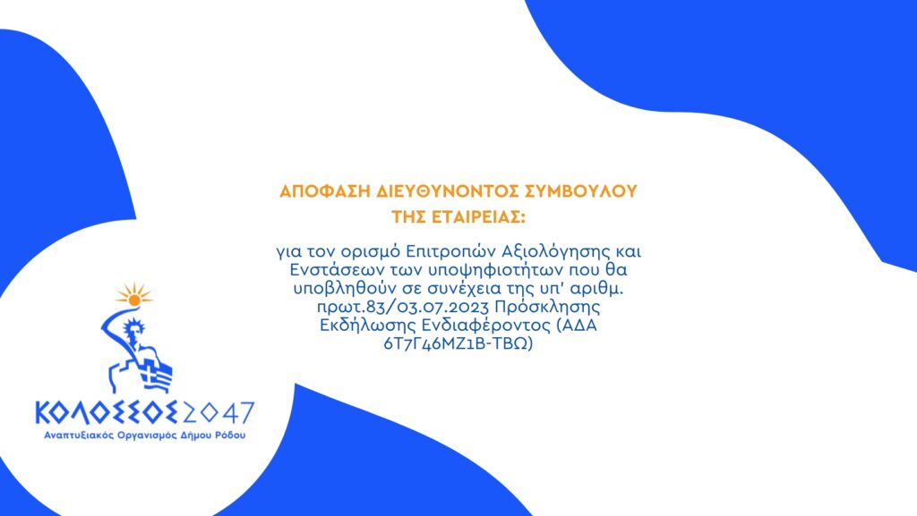 Απόφαση Διευθύνοντος Συμβούλου της εταιρείας για τον ορισμό Επιτροπών Αξιολόγησης και Ενστάσεων των υποψηφιοτήτων που θα υποβληθούν σε συνέχεια της υπ’ αριθμ. πρωτ.83/03.07.2023 Πρόσκλησης Εκδήλωσης Ενδιαφέροντος (ΑΔΑ 6Τ7Γ46ΜΖ1Β-ΤΒΩ)