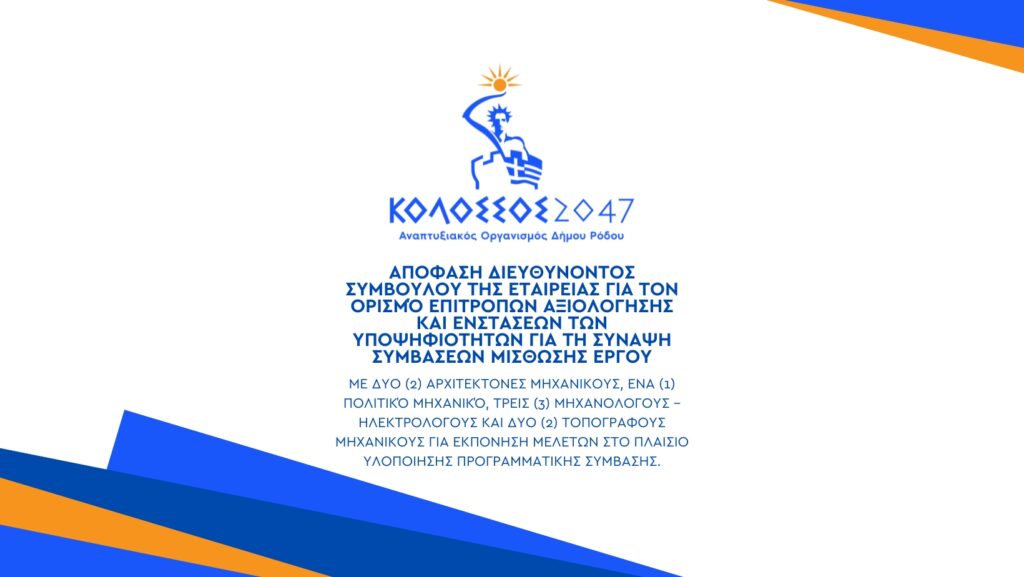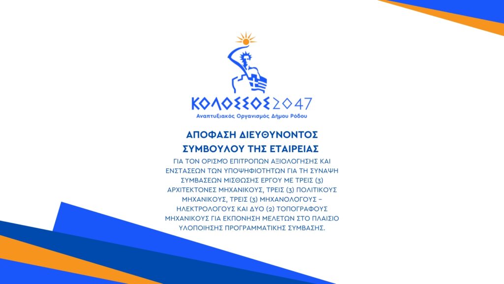 Απόφαση Διευθύνοντος Συμβούλου της εταιρείας για τον ορισμό Επιτροπών Αξιολόγησης και Ενστάσεων των υποψηφιοτήτων για τη σύναψη συμβάσεων μίσθωσης έργου που αναρτήθηκε 25/01